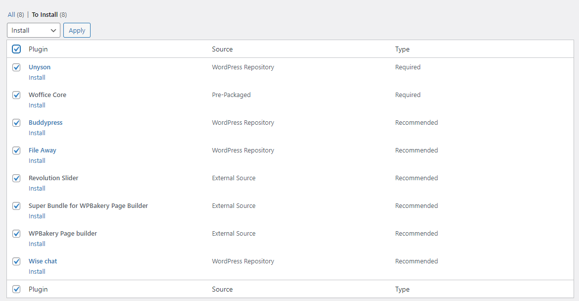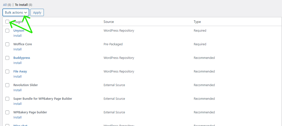 Upon click, you will be redirected to the plugin installation page. Here, click the Plugins checkbox, and then the Bulk actions dropdown box.