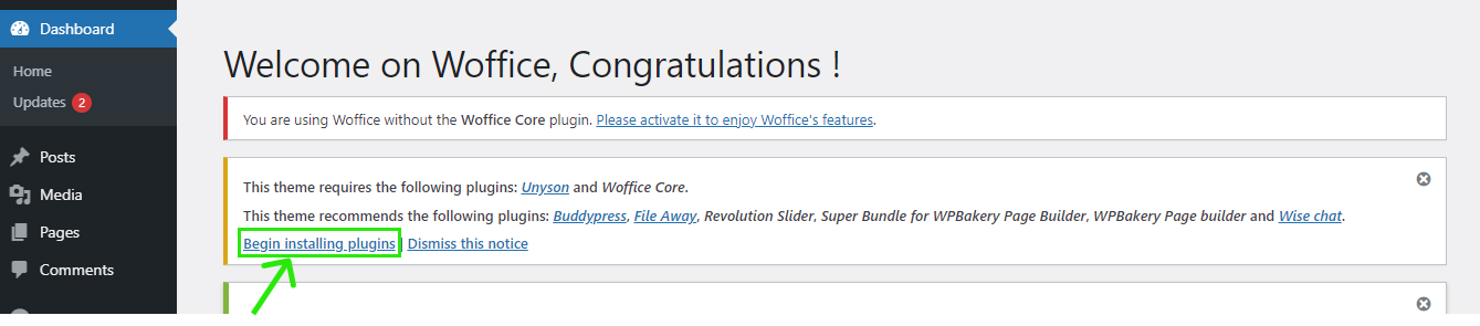 Once you’ve uploaded the Woffice theme, install and activate it. With that done, proceed to step 2.