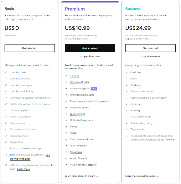 Premium: It costs $13.49 per user per month when billed monthly and $10.99 per user per month when billed annually. Asana Premium provides advanced project management features such as: Advanced reporting, Set milestones, Create task dependencies, Create customizable dashboards, and Create a workflow builder.