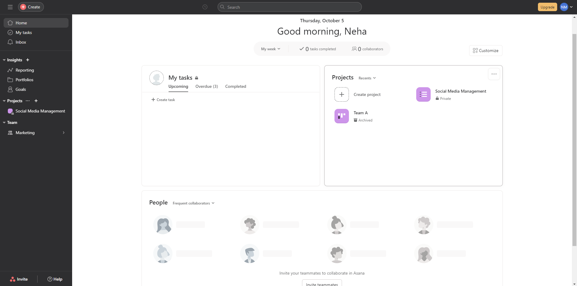 Asana’s user interface is also simple and intuitive. You can find an easy-to-navigate tab on the left panel containing My Tasks, Inbox, Insights which has reporting, portfolios, goals, and Projects. Then, you can also view your Team.